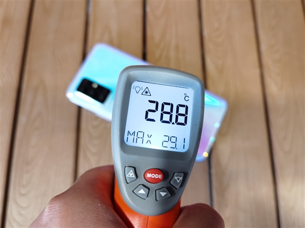 首先是最常规的视频播放,对当前大部分智能手机来说,看视频的负载是中度的,荣耀30S在播放36分钟1080p视频之后,温度最高只有29°C,比室温高出3°C左右,摸上去丝毫没有发热的感觉。